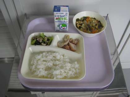 今日の献立はごはん、牛乳、鶏肉のおろしじょうゆかけ、みそ汁、こまつなのいためものです。