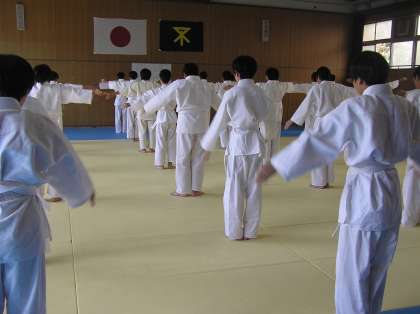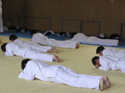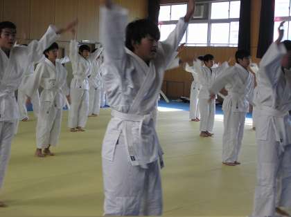 2年男子体育の様子です。柔道の寝技をしています。十分なストレッチや補強運動の後、試合形式で授業を実施しました。真剣に取り組んでいる表情が印象的です。