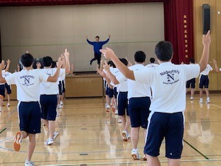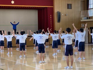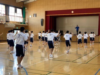 体育の授業です。男子はダンスです。KPOPのリズムにのせて軽快?に、ステップを踏んでいました。最後には汗だくになって1サイクルのダンスを完成させました。
