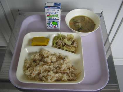 献立は、かやくご飯、牛乳、豚肉と野菜のいためもの、いわしのつみれ汁、かぼちゃういろうです。