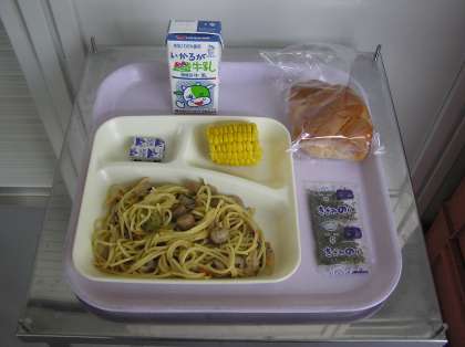 献立は、パン、牛乳、ウインナーときのこの和風スパゲッティ、焼きとうもろこし、固形チーズです。
