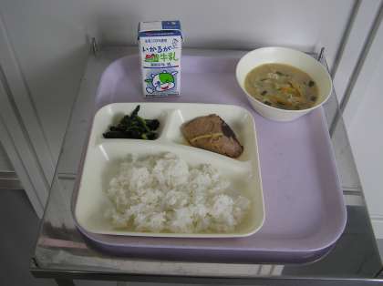 献立は、ごはん、牛乳、なまりぶしのしょうが煮、じゃがいものみそ汁、ほうれんそうのおひたしです。