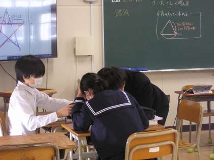 図形の単元をしています。多角形の外角や三角形の合同を使って、角度や辺の長さを求める学習に取り組みました。分からないところを教え合いながら、最後はみんなで正解を確認しました。