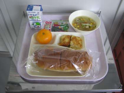 献立は、パン、牛乳、ツナポテトオムレツ、鶏肉とキャベツのスープ、みかん、豆こんぶです。