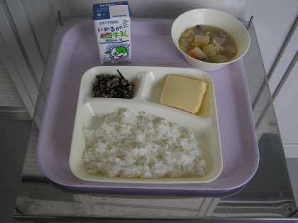 献立は、ごはん、牛乳、卵どうふ、一口がんもと野菜の煮もの、魚ひじきそぼろです。