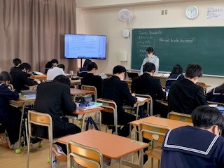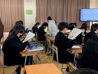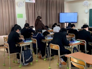 3年2組は英語です。長文の聴き取り、英訳、書き取り、話す、それぞれのポイントの説明があり、実践しています。