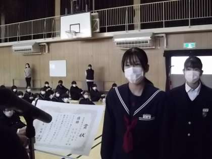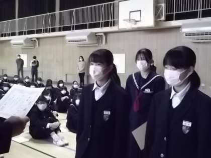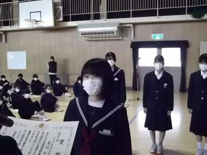 全校集会に先立ち、伝達表彰を行いました。税に関する作文とバドミントン部が表彰されました。