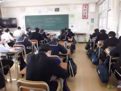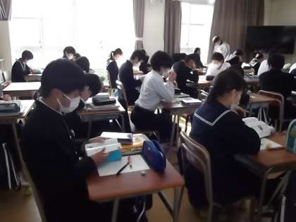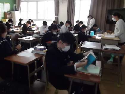 2年英語の授業です。受動態の学習をしました。問題演習をしながら理解を深めていきました。分からない単語は辞書をひき、少しずつ知っている単語の数を増やしながら、助動詞と受動態の組み合わせた表現についても取り組みました。