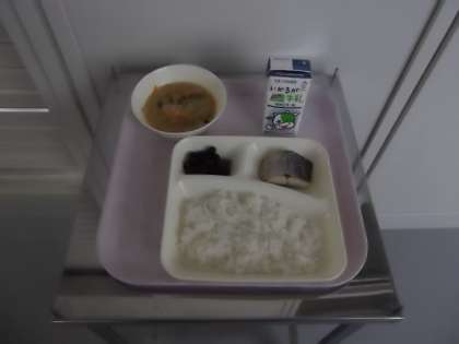 献立は、ごはん、牛乳、さごしのしょうゆだれかけ、みそ汁、黒豆の煮ものです。