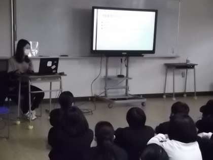 1年生にスクールカウンセラーから虐待について講話をしていただきました。虐待とは何なのか、対応の仕方や、相談する方法など分かりやすい言葉でモニターを使いながら講話をしていただきました。