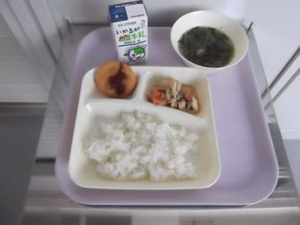 献立は、ごはん、牛乳、鶏肉の土手焼き風、はりはり汁、れんこんのフライ大阪ソース味です。
