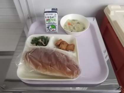 献立は、パン、牛乳、白菜のクリーム煮、あつあげのごまじょうゆかけ、豚肉とさんどまめのオイスターソースいためです。