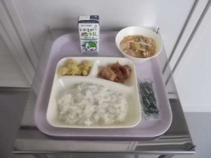 献立は、ごはん、牛乳、鶏肉の甘辛焼き、かす汁、くりきんとん、焼きのりです。