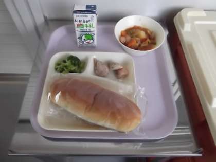 献立は、パン、牛乳、鶏肉のバジル焼き、ウインナーと野菜のケチャップ煮、ブロッコリーのサラダです。