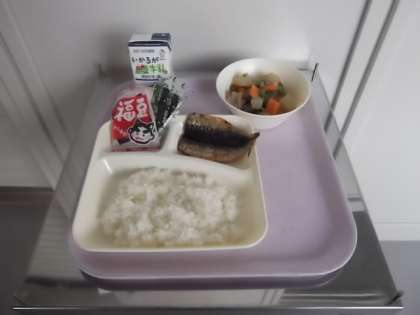 献立は、ごはん、牛乳、いわしのしょうがじょうゆかけ、含め煮、いり大豆、焼きのりです。