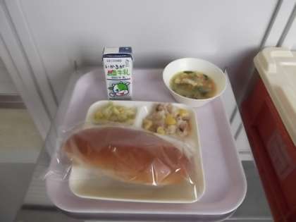 献立は、パン、牛乳、中華おこわ、卵スープ、キャベツのオイスターソースいためです。