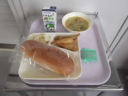 献立は、パン、牛乳、わかさぎのフライ、コーンと白菜のスープ、カリフラワーのサラダです。