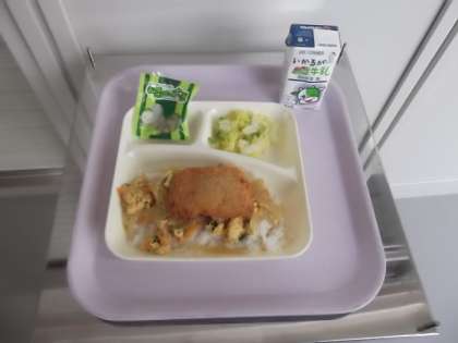 献立は、カツ丼、白菜の甘酢あえ、抹茶大豆、牛乳です。