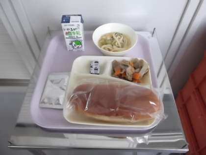 献立は、パン、牛乳、豚肉とごぼうの煮もの、なにわうどん、固形チーズです。