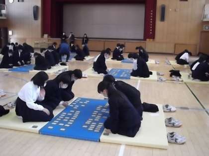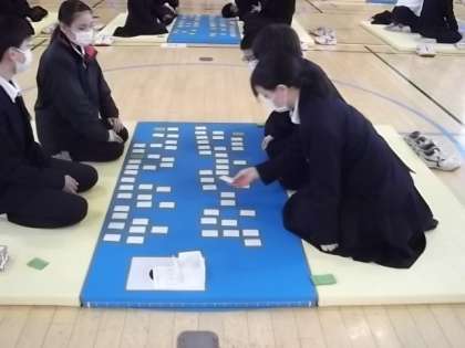 日程の変更はありましたが、1年生で百人一首大会を実施しました。想像していたよりも覚えている人が多く、上の句で札をとれる人も多くいました。大変、盛り上がった大会でした。