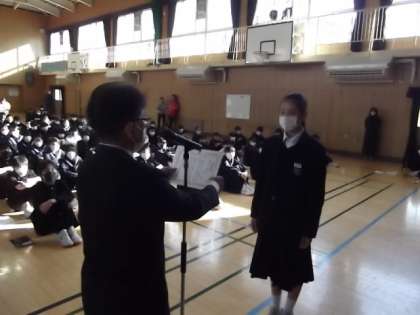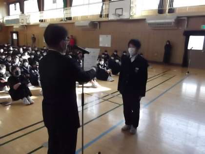 全校集会に先立ち伝達表彰を行いました。読書画コンクールとペットボトルキャップ回収キャンペーンで表彰がありました。
