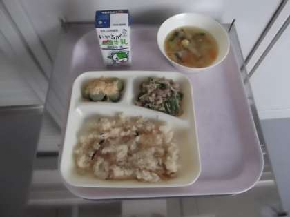 献立は、かやくご飯、牛乳、豚肉と野菜のいためもの、すまし汁、きな粉よもぎだんごです。