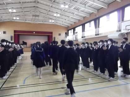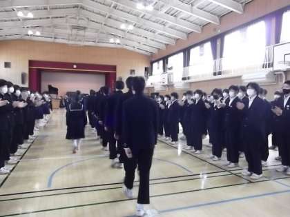 卒業生を送る会は1,2年の全員が卒業生と対面する最後の機会となります。贈る言葉や合唱を通して在校生の気持ちを卒業生に届けました。卒業生も代表生徒が在校生に言葉を送り、最後に合唱をしました。