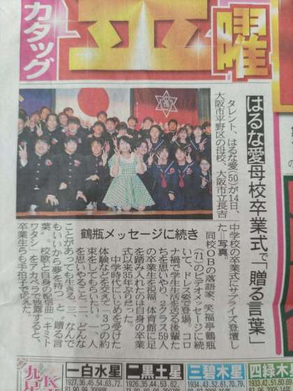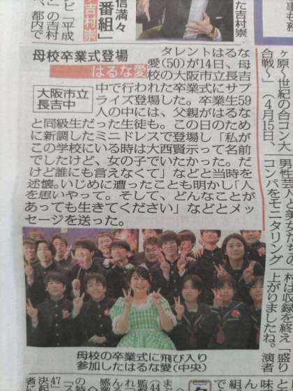 はるな愛さんが長吉中学校の卒業式にサプライズで登場されたことが新聞記事になりました。