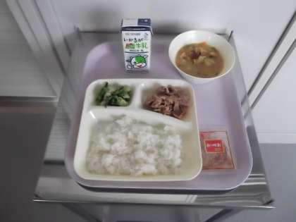 献立は、ごはん、牛乳、豚肉の生姜焼き、さつまいものみそ汁、菜の花のおひたしです。