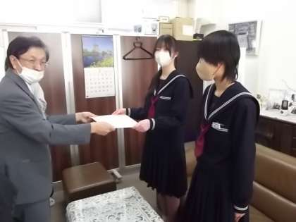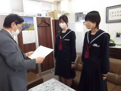 生徒を代表し、前生徒会長の高山さんと現生徒会長の塩川さんが表彰状を受け取りました。今までの取り組みを評価してもらえたことは嬉しいですね。