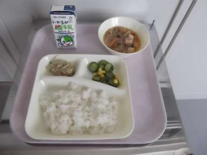 献立は、ごはん、牛乳、マーボー豆腐、きゅりとコーンの甘酢あえ、もやしとピーマンのごま炒めです。