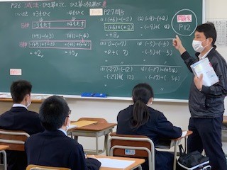 3組は数学です。正の数負の数で、減法の考え方を説明して練習問題に取り組みました。