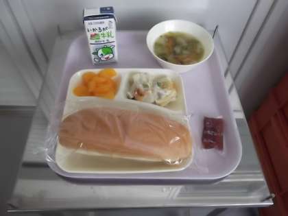 献立は、パン、牛乳、マカロニグラタン、キャベツのスープ、みかんです。