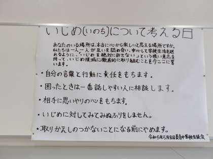 5/8(月)にあった「いじめ(いのち)について考える日」の掲示物を、玄関にある生徒会連絡掲示板に掲示しました。