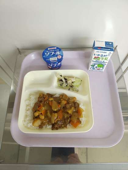 献立は、牛肉と大豆のカレーライス、牛乳、キャベツのひじきドレッシング、ヨーグルトです。