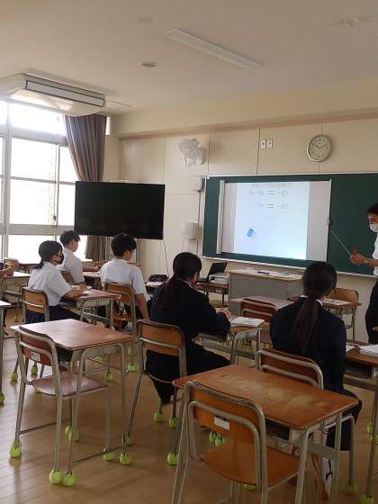 2年2組数学の様子です。少人数展開をしています。班別学習を行ったり、プロジェクターを使ったりしながら学びを深めています。