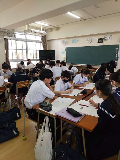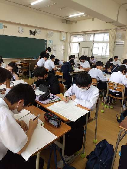 中間テストの振り返りを行いました。班に分かれて教え合うことで、自分の間違いに気づき正しながら進めました。