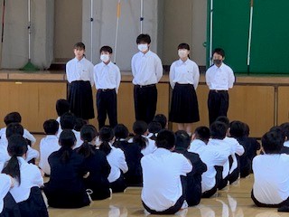 1組の松井さんの司会で、体育委員から、先日の一泊移住のよかっこと、反省することを振り返り、これからの学校生活にいかす目標・見通しを各自が発表しました。