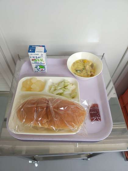 今日の献立は、パン、牛乳、いちごジャム、かぼちゃのクリームシチュー、キャベツのゆずドレッシング、和なしです。