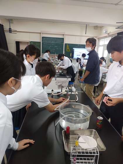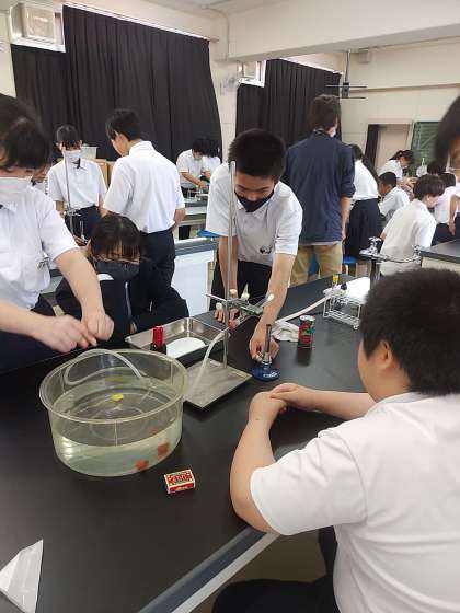 炭酸水素ナトリウムの加熱分解の実験をしました。ガスバーナーを使いながら一生懸命に取り組んでいました。