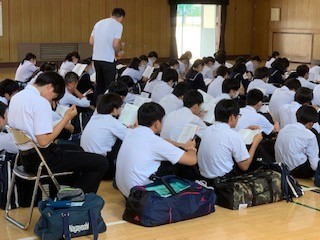 明日からの修学旅行に向けて、栞をもとに3日間の行程など最終のチェックを行いました。修学旅行実行委員が決めたルールを遵守し、76期生みんなが楽しみ、有意義な時間(とき)を過ごす学校行事にしましょう。明日は、早朝の出発です。体調を崩さないようにいつもよりは早く寝て明日に備えてください。
