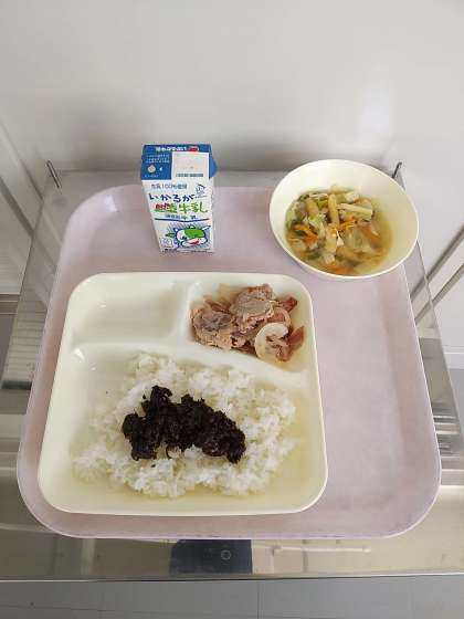 献立は、ごはん、牛乳、豚肉の甘辛焼き、五目汁、のりのつくだ煮です。