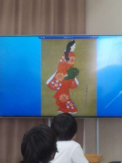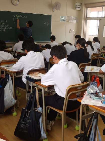 2年社会の様子です。元禄文化について学習しました。代表的な作品や作者の特徴を生徒が興味をもちそうな話題と共に紹介していました。生徒の生き生きした表情が印象的です。