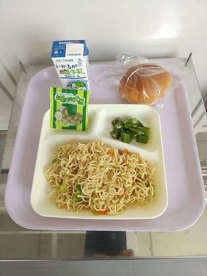 献立は、パン、牛乳、和風焼きそば、オクラの甘酢あえ、抹茶大豆です。