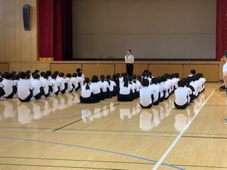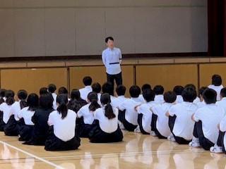 定例の2年学年集会です。清水先生から、[他人(ひと)に好かれる人ってどんな人?]について自身の中学生時代での出来事、経験談を交えてお話しがありました。生徒からは、「他人に優しくできる人」「目配り・気配りできる人」などの意見が出されました。中には「お金をたくさんくれる人」と現実的ユニークな?意見もありましたが、「素直な心で人の話しを聞ける」こと、それを「継続する」ことが大切であることをまとめとしてお話しされました。