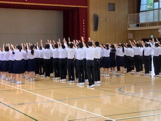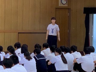 学代の木原さんから、今月の目標「個人と集団のレベルアップ」について「その主旨の確認とさまざまな場面で意識して有言実行していこう」と、本所先生から「来週の期末テストに向けて、勉強モードにしっかり頭を切りかえて、土曜・日曜を過ごしてください。いろいろなことを成し遂げていくためには、頭・気持ちの切りかえが大切です」と、木村先生から、7月7日に行われるティーンズヘルスセミナーについて、のお話しがそれぞれありました。
