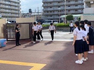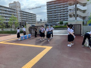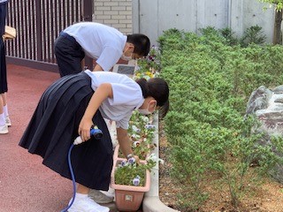 期末テストも終わり、日常の登校風景です。心を繋ぐ挨拶運動、美化委員の草花の世話と活動が始まりました。蒸し暑い日が続きますが、1学期の締めくくりにがんばる長中生です。