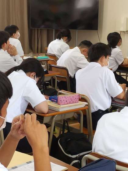 不定詞の使い方を学習しました。不定詞を使いながら英訳をし、解答をみんなで共有しながら進めました。学習内容がレベルアップしていきます。頑張れ長中生。