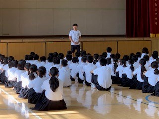 日下部先生から「集団生活のなかでの『気配り』のススメと、先を見据えて今自分はどうしなければならないか考えられる『気づき』の行動を心がけましょう」とお話しがありました。