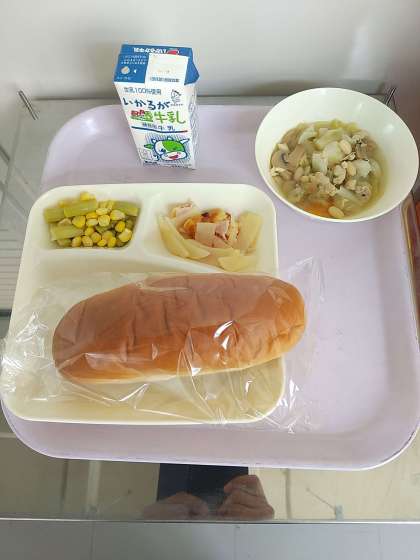 献立は、パン、牛乳、鶏肉とてぼ豆のスープ煮、じゃがいもとトマトのチーズ焼き、グリーンアスパラガスとコーンのサラダです。